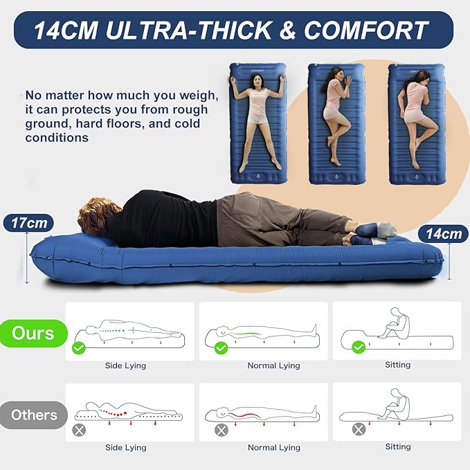 • Extra Large Pad and Maximum Comfort:The Origem extra-thick inflatable sleeping pad is the best choice for campers! Its large size of 78.7x29.9x5.5 inches can accommodate all body types. The 5.5-inch thickness not only provides insulation, but also supports various postures without worrying about touching the ground. The U-shaped design can wraps your body better, prevents slipping, and allows you to sleep comfortably, firmly and securely outdoors.