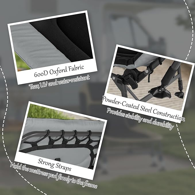• Camping Ready: Swiveling tripod feet prevent our portable bed from sinking in loose ground. It features a strong steel frame with a powder coat to endure water without issue. Its surface is made of rugged, 600D Oxford fabric, helping it resist tearing when your adventure includes rough conditions.