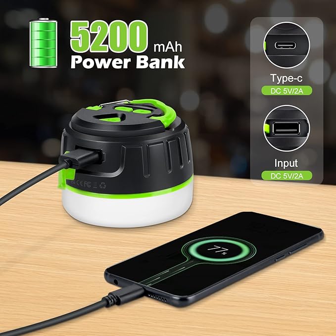 • ✅【5200mAh Power Bank】Rechargeable camping light is equipped with a high-quality 5200mAh battery, This Led lantern not only provides reliable illumination but also serves as a convenient emergency power supply for charging mobile devices, providing up to 150 hours of low-brightness illumination for extended outdoor adventures.