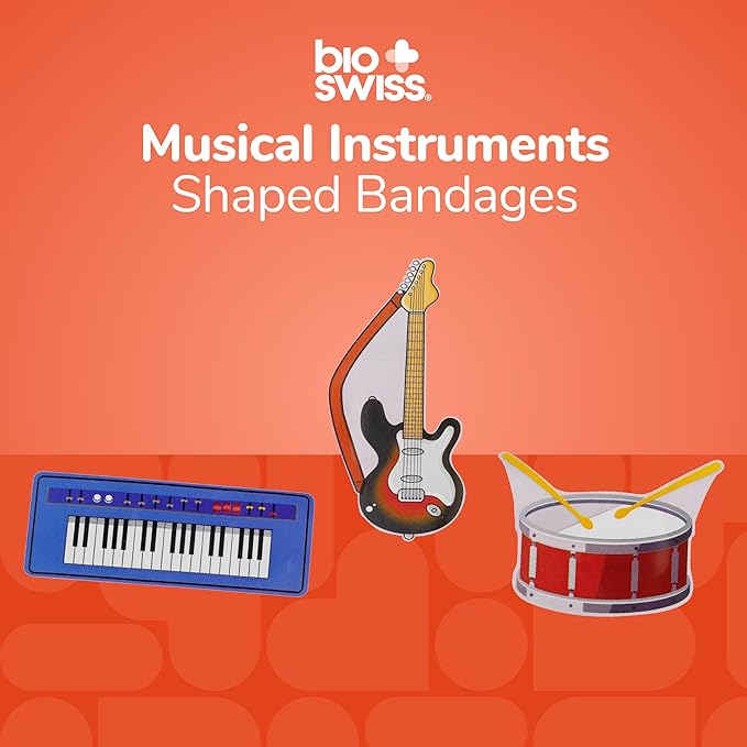 BioSwiss Bandages, Musical Instruments Shaped Self Adhesive Bandage, Latex Free Sterile Wound Care, Fun First Aid Kit Supplies for Kids and Adults, 50 Count