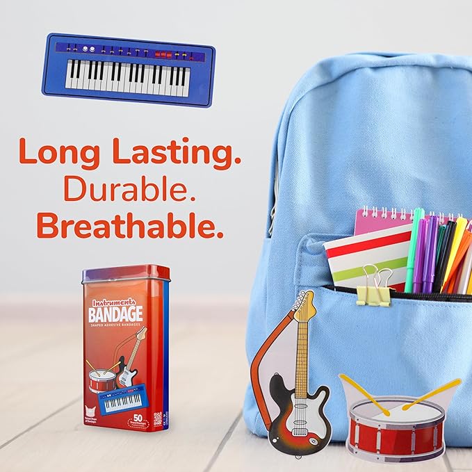 • MUSICAL INSTRUMENT BANDAGES: This 50 piece tin of Music Instrument bandages feature fun electric guitar, keyboard, and drums shapes, and is great for putting a smile on kids' faces while protecting wounds such as cuts, scrapes, and burns; sticky bandages come in a cute cardboard box and are perfect for kids and adults alike, and also for school nurses and pediatric doctors