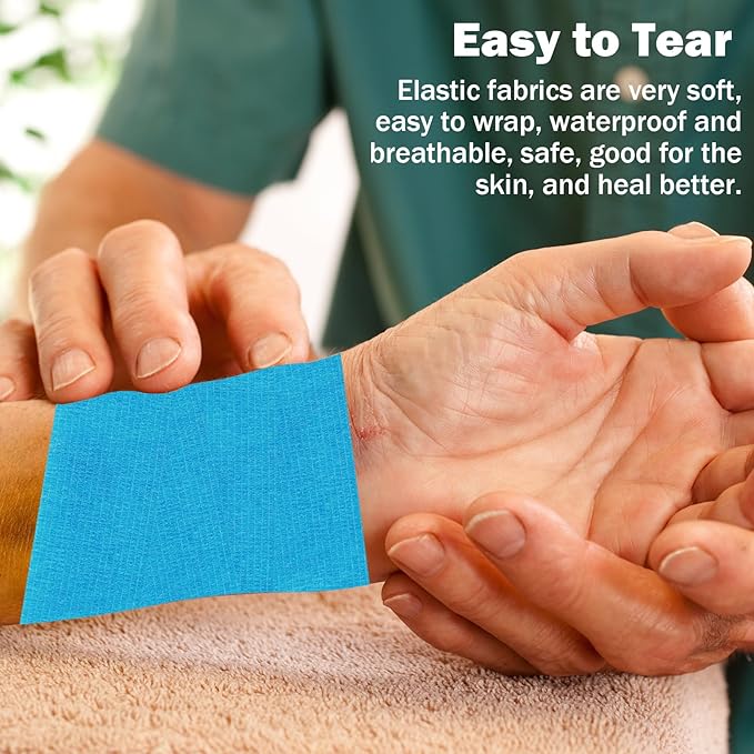 • Cohesive bandages are easily torn without scissors, simply hand tear and wrap your wrists, fingers, ankle, back, knee and other body areas.Elastic bandages that are strong and provide excellent support.They will adhere very well to themselfs but poorly to other surfaces such as skin or hair making it pain-free to pull them off and change bandages.