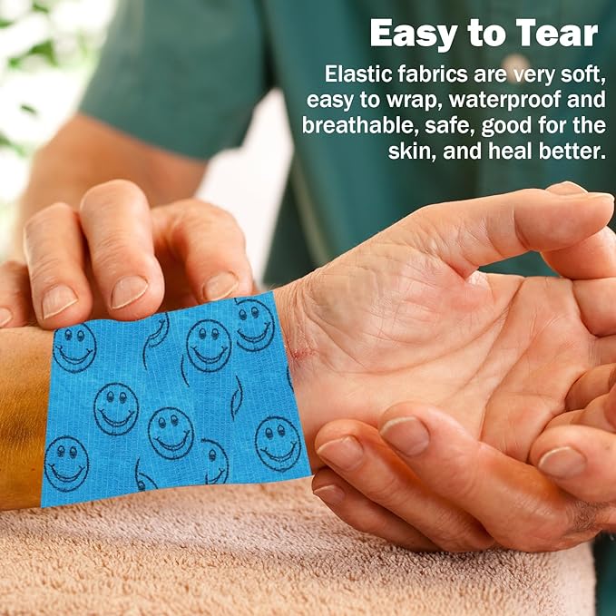 Cohesive Bandage First Aid Tape - Self Adherent Wrap Adhesive Bandages - Colorful Bandages (Blue Smile, 2-Inch)
