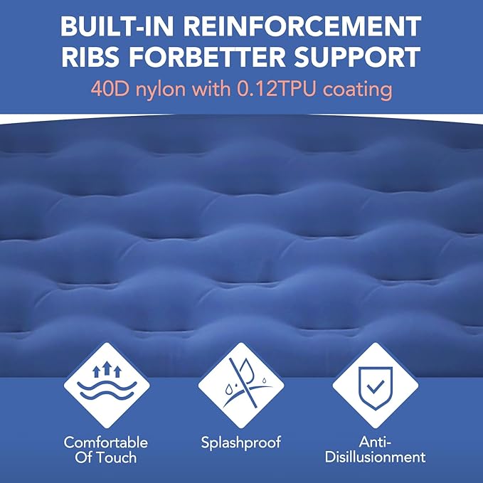 • 【40D nylon polyester & multi-layer TPU】:This camping bed mat is made of ultra-tough 40D nylon and inner waterproof TPU sealing coating, keeping you warm off the ground and keeping you from lying on the cold or rocky ground. the soft and cozy flocked top with a nice touch, keeping quiet when rolled over no squeaking for a comfortable night's sleep under the stars.