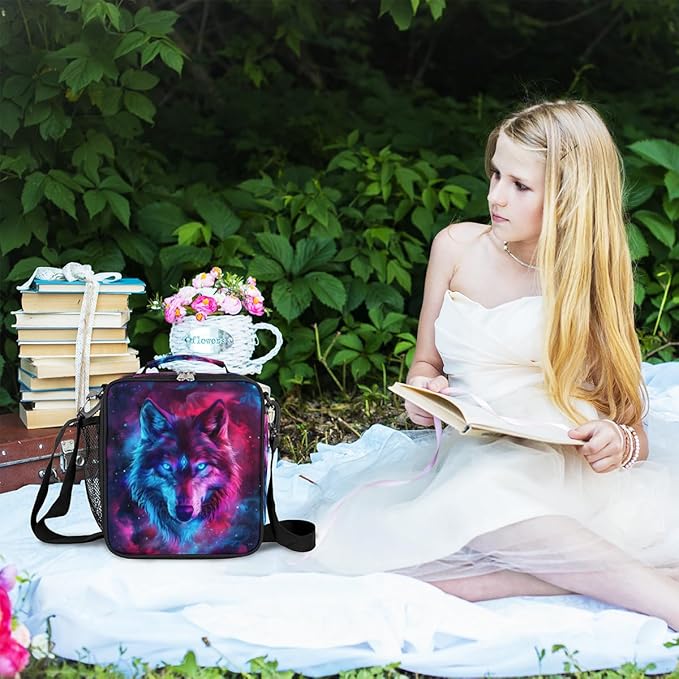 Wolf Lunch Box for Kids, Ethnic Wolf Space Galaxy Lunch Bag for Boys Girls, Reusable Insulated Waterproof Lunch Box with Adjustable Shoulder Strap Thermal Cooler Tote Bag for School Daycare Picnic