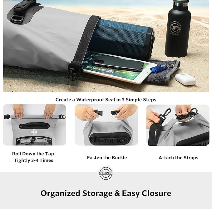 • EASY-TO-USE ROLL TOP CLOSURE: Keep water out effortlessly with our intuitive roll-top closure. Simply fold the dry pack down 3-4 times, secure the buckles, and you're set for any adventure!