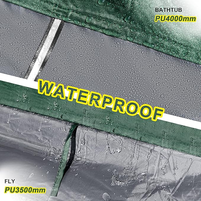 • 【Weatherproof Tent】Stay dry and comfortable in any weather condition with our rainproof and windproof tent. The highly water-resistant fabric and sturdy aluminium poles with secure pegs ensure stability and protection during heavy rain and windy weather. Besides, the built-in snow skirt carries rain and snow away from the hiking tent, keeping you warm and dry in wet or snowy conditions.