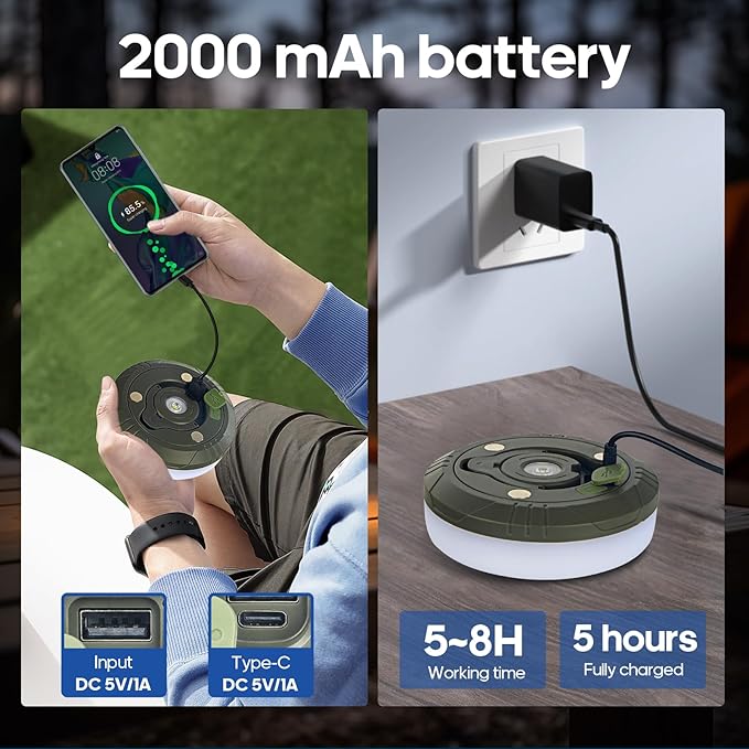 • 【USB Charging & High Capacity Battery】The rechargeable light string has a built-in 2000mAh battery, which can provide 5-8 hours of lighting for outdoor play. The tent light string can also be charged by USB, use it while charging. Provide users with a more convenient and environmentally friendly experience, perfect for outdoor activities, and can also charge your cell phone if needed in an emergency (free data cable).
