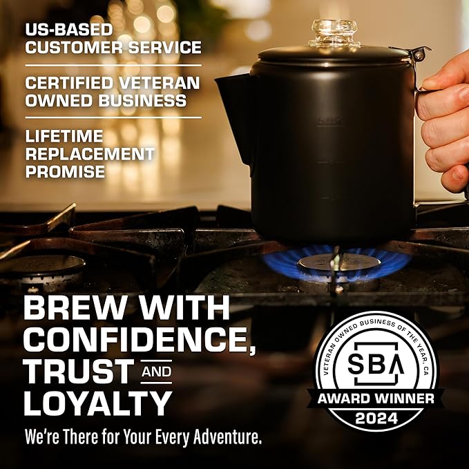 • PROTECTIVE BLACK COATING — We coated an already sturdy & durable percolator to make our sleekest looking coffee maker yet. Brew in style and make your bold camping coffee in something really cool lookin’.