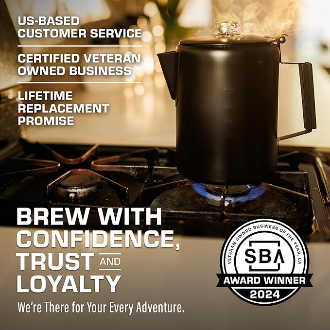 • PROTECTIVE BLACK COATING — We coated an already sturdy & durable percolator to make our sleekest looking coffee maker yet. Brew in style and make your bold camping coffee in something really cool lookin’.