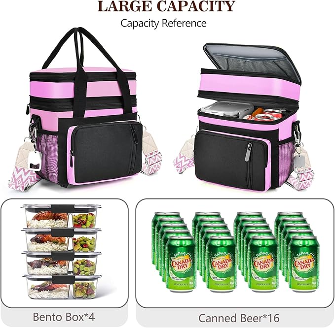 LOKASS Lunch Box for Women/Men-16L-Insulated Lunch Bag, Expandable Double-layer Leakproof Cooler Bag with Upgrade Adjustable Shoulder Strap Ideal for Work/Travel/Picnics(Pink&Black)