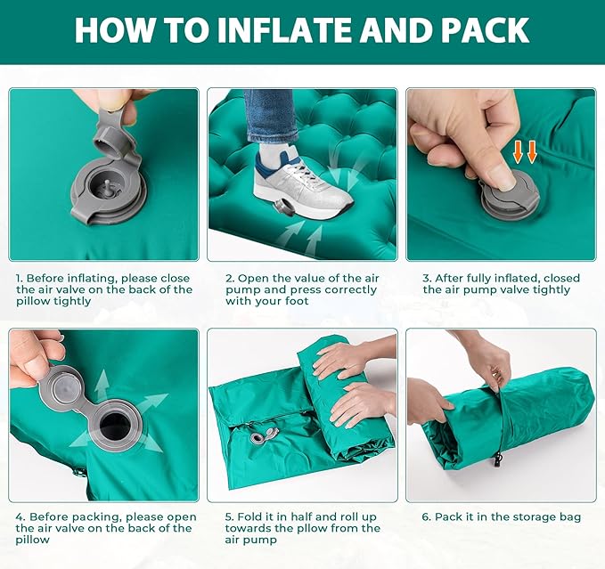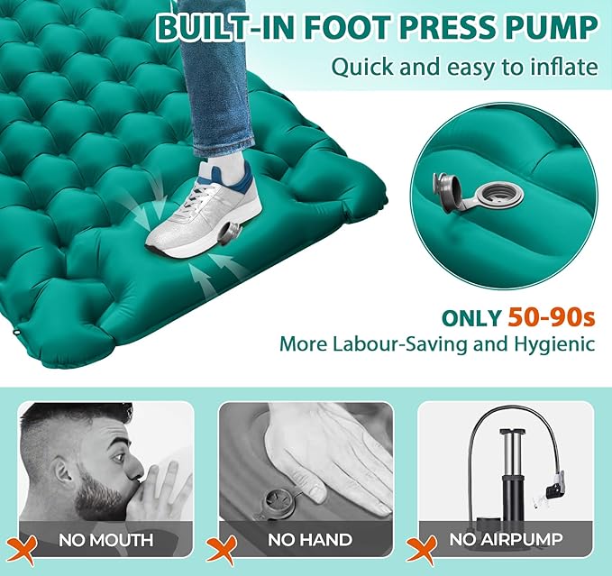 • ⛺ Fast Inflation Camping Pad - It's time to say goodbye to the hassle of inflating by mouth or carrying a bulky air pump. You can easily inflate it in about 50-90 second because the sleeping mat has a built-in foot pump. There is an anti leakage film in the valve, Inflate it once and it will last for several weeks.