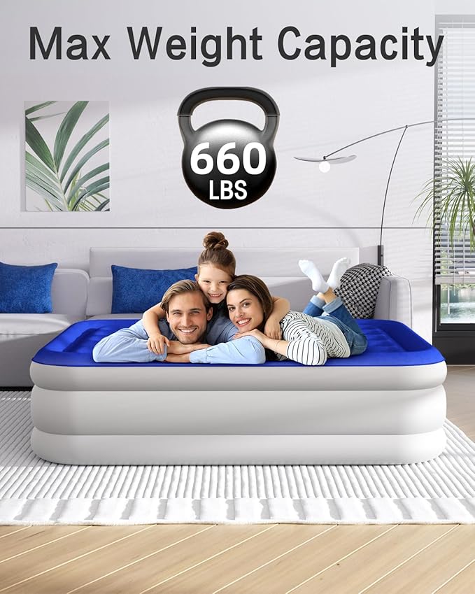 • HIGH QUALITY-Upgrade of material waterproof and puncture resistant and more healther,18"raised queen air mattress ergonomic design and exquisite craftsmanship stable strutural support provides firm full body support 660 LBS.