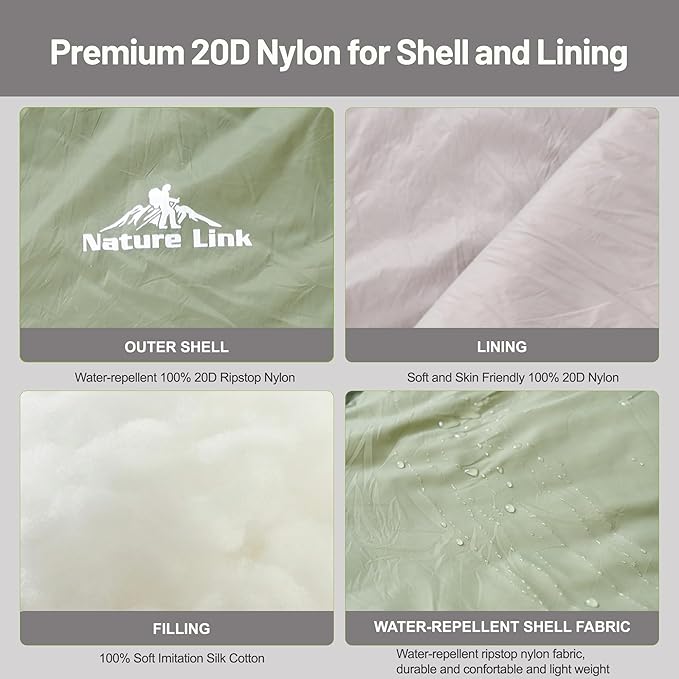 • DURABLE NYLON SHELL AND LINING: This sleeping bag is made of 20D ripstop nylon for shell which is water-repellent, and 20D soft nylon for lining, which is comfortable and skin-friendly, provide you with a warm relaxing sleep.