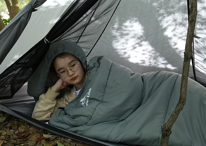 • WARM AND LIGHTWEIGHT: This mummy sleeping bag is filled with 300g/㎡soft imitation silk cotton insulation, provides a comfortable temperature rating of 42℉-55℉, it is designed to keep you warm while remain lightweight. Weighs just 2.87 lbs, can be compressed down to 13" in height.