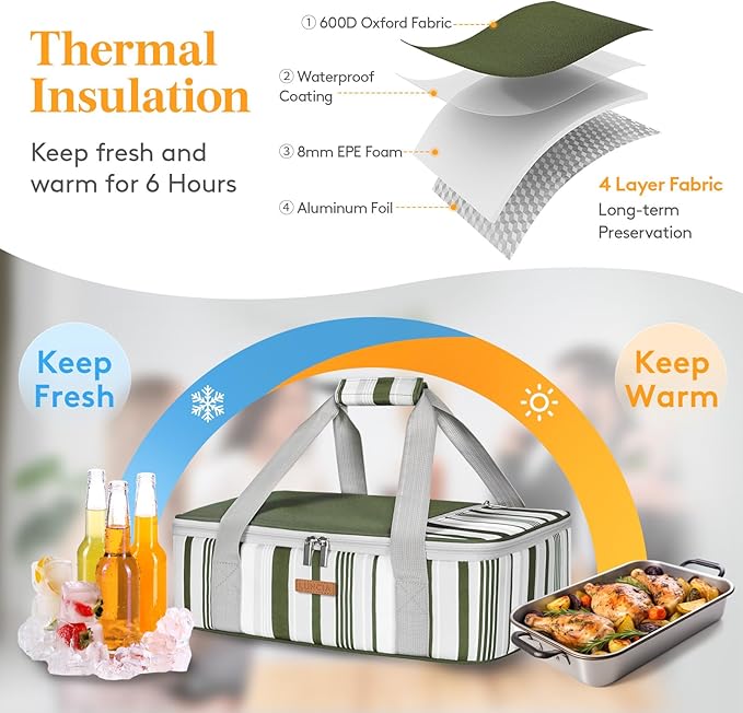 • Keep Food Hot or Cold Hours: The interior lining is made of food-grade aluminum foil and padded with 8mm EPE foam for great thermal resistance. The exterior of the Casserole Carrier is made of 600D water-resistant, dirt-proof Oxford fabric for long lasting durability and easy cleaning.
