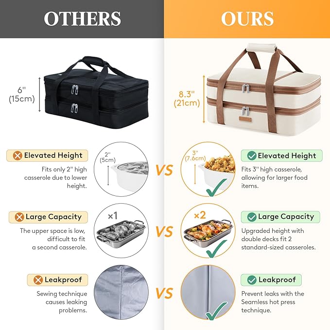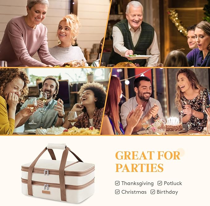 Double Decker Insulated Casserole Carrier for Hot or Cold Food, Lasagna Lugger Tote for Potluck Parties/Picnic/Cookouts, Fits 9"×13" Baking Dish, Cream