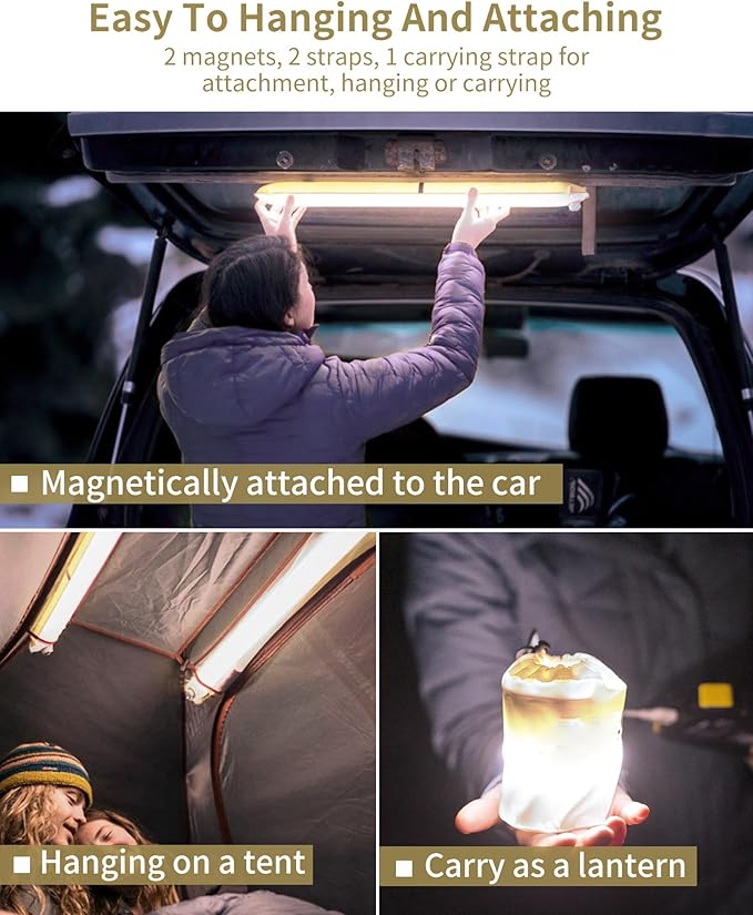 • MULTIPLE FIXING METHODS: This camping light has three fixing methods: hanging, strap and magnetic, with straps on the top and the back, it can be easily hung or fixed on tents or various objects when camping, and the built-in magnet allows you to fix it to any iron surface, such as a car, tent poles and so on.