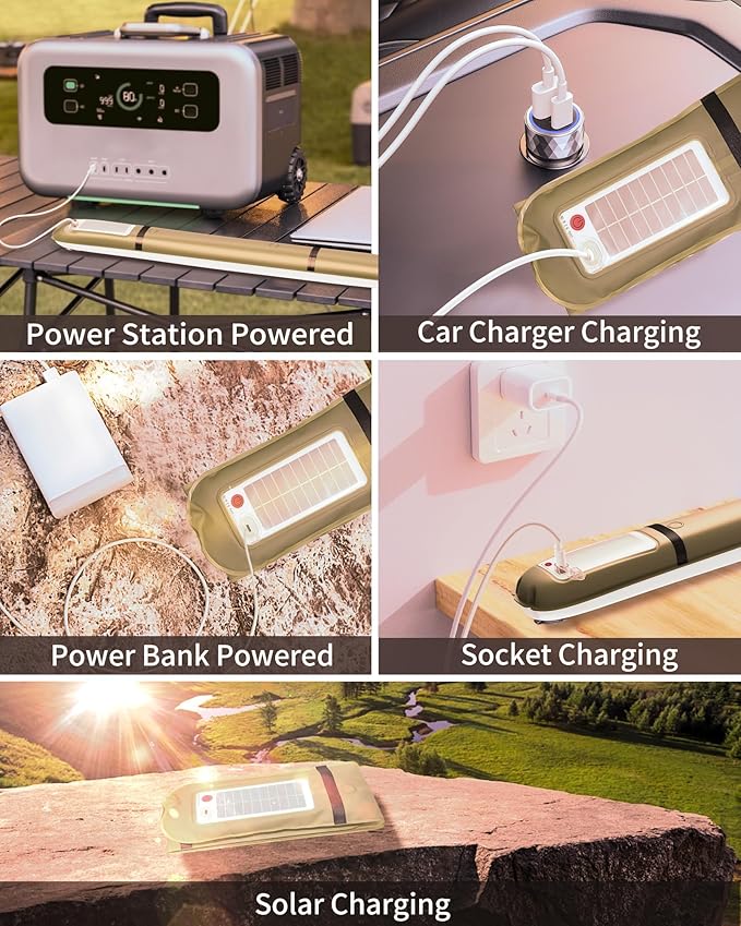 Solar/Type-C Rechargeable Camping Light Bar, IP66 Waterproof LED Tube, TPU Ultralight Electric Light, 2000mAh Foldable Inflatable Outdoor Tent Light for Camping, Hiking, Traveling, Party (Khaki 2 PCS)