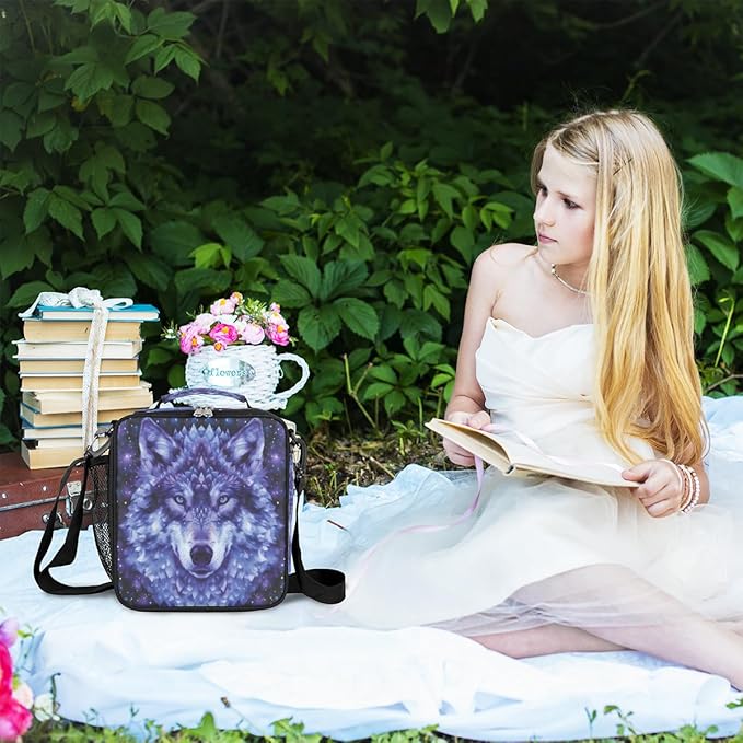 cfpolar Wolf Lunch Box for Boys Girls, Insulated Lunch Bags for Kids Reusable Mini Cooler Lunch Tote Lunchbox Thermal Meal Tote Kit with Shoulder Strap for Work School Picnic