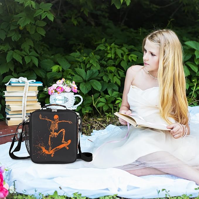 cfpolar Skull Skateboard Lunch Box for Boys Girls, Insulated Lunch Bags for Kids Reusable Mini Cooler Lunch Tote Lunchbox Thermal Meal Tote Kit with Shoulder Strap for Work School Picnic