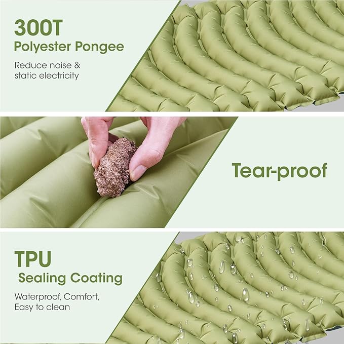 • Durable TPU Coated & High-quality 300T Polyester Pongee, Perfect for any Weather Conditions: The sleeping pad is made from high-quality 300T polyester Pongee material, reducing noise & static electricity. With extra-thick and durable TPU coating, offering tear resistance, waterproof, thermal insulation, resists moisture, and is easy to clean. Suitable for various terrains such as rocks, beaches, grasslands, etc.