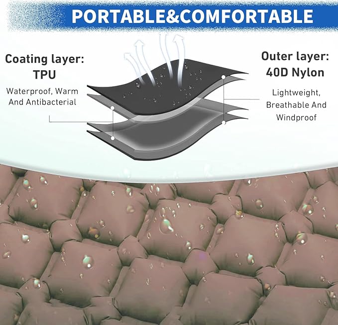 • 2.Superior Comfort and Durability: Goodbye to sleeping pad for camping uncomfortable outdoors. With a thickness of 6cm and a weight capacity of 660lb, this sleeping pad features a hexagonal design and multiple air chambers that evenly distribute pressure, providing exceptional comfort and resilience.