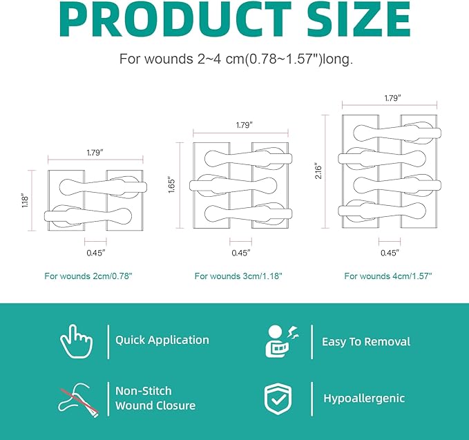 • APPLICABLE SIZES: 2 Strips - For wounds 2cm/0.78", 3 Strips - For wounds 3cm/1.18", 4 Strips - For wounds 4cm/1.57". After using the wound closure strips, apply this dressing to protect the wound. It is recommended to close the wound urgently after injury or to reduce wound tension after surgery to reduce scar formation. USE AFTER SURGERY MUST FOLLOW THE DOCTOR'S ADVICE.