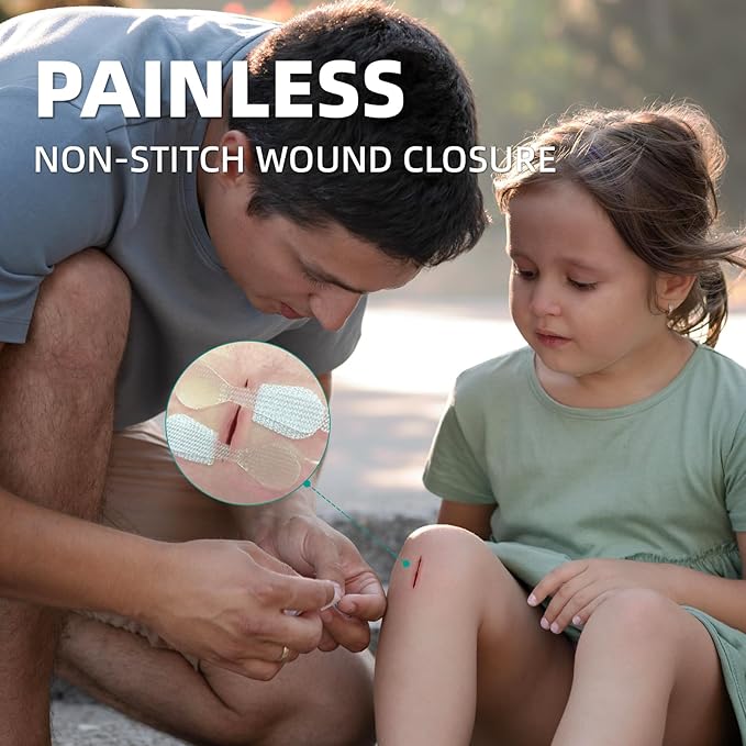 • WOUND CLOSURE STRIPS: It is a non-invasive, painless, alternative to stitches. The laceration closure kit is more convenient than traditional stitches. The device can reduce tension, reduce hyperplasia and beautify wounds, and is ideal for sensitive skin and kids, ensuring a safer and faster recovery.