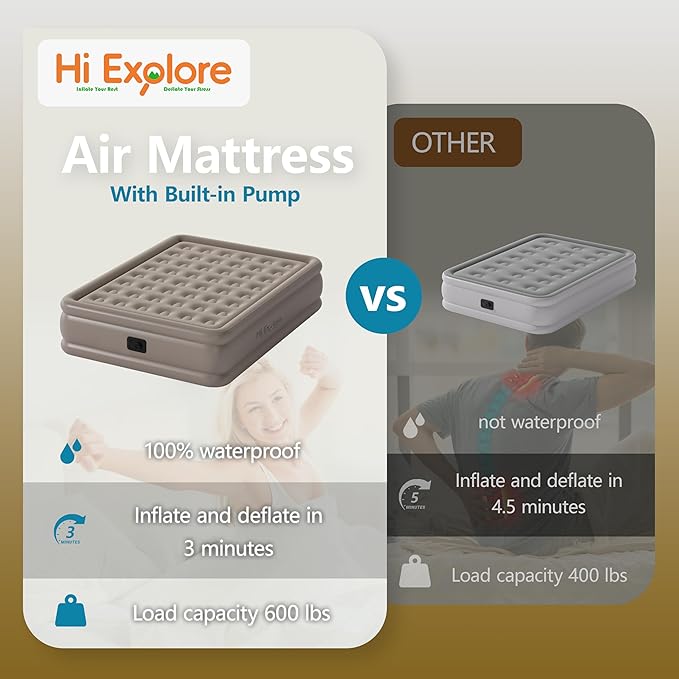 • 【Premium Air Mattress with Built-In Pump】 Quick and easy inflation and deflation are just a few pumps away with our integrated pump system. This air mattress is perfect for both home comfort and outdoor adventures. It inflates fully in just 3 minutes and retains air for days. Easily adjust the inflation to your desired comfort level!