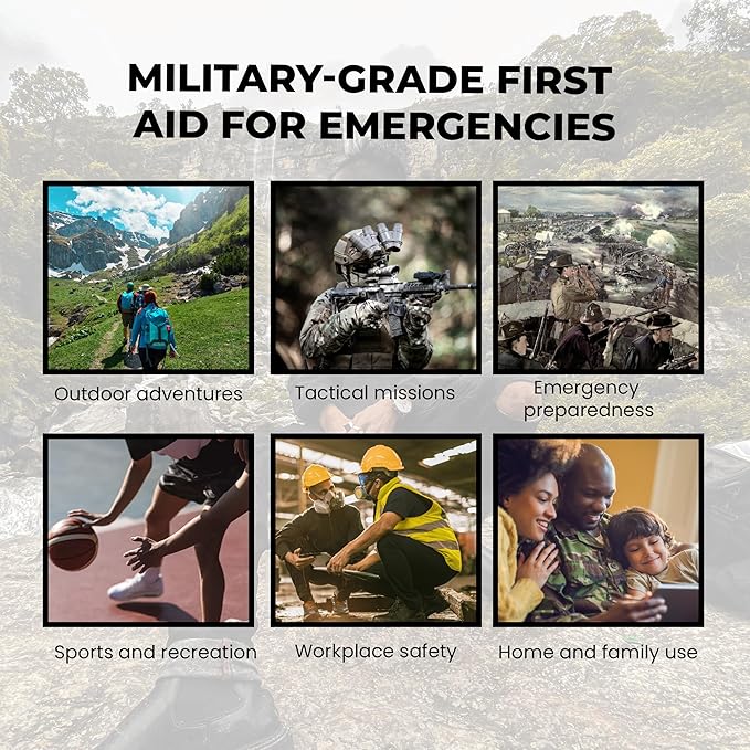 • VERSATILE APPLICATIONS: From outdoor adventures to tactical missions and everyday emergencies, this outdoor medical kit with a quality Tourniquet is versatile enough to meet various needs. Whether you're a first responder, military personnel, or simply a prepared individual, this military medical kit ensures you're ready to handle unexpected medical situations effectively and efficiently.