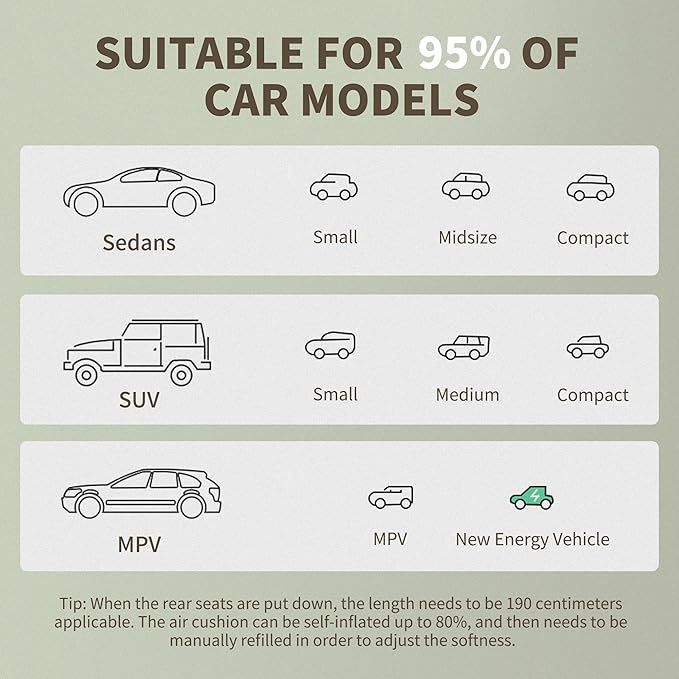• WIDE RANGE OF USAGE SCENARIOS: The size of the car mattress is 197*134cm/ 77.6*52.8''. You can fold the air mattress after pumping and then roll it up, tie it with a strap and then put it into the storage carry bag. The carry bag can be carried or carried on your back, convenient for you to go to the following scenarios: camping / outdoor / home / travel / car