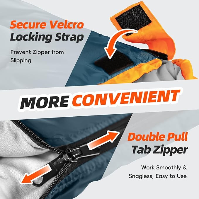 • EXCELLENT DESIGN : The double pull tab zipper on the right side makes it easy for you to open and close from inside or outside, work smoothly & snagless. The zipper at the bottom lets you ventilate the foot section for better temperature control. On warm nights, unzip it and use like a blanket