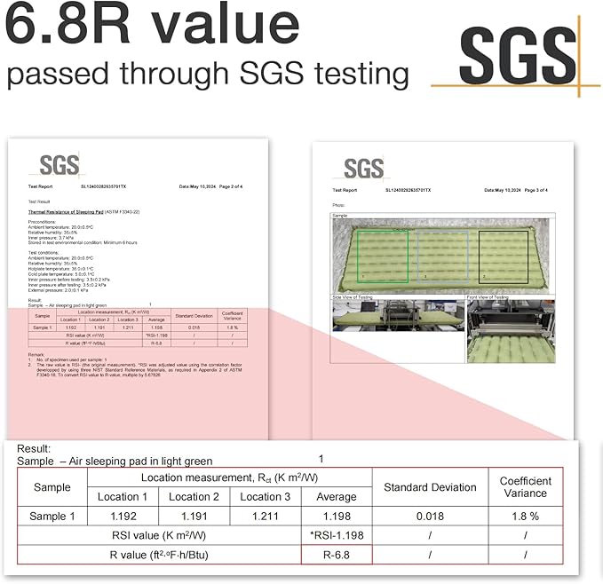 • 【SGS Certified High R-value】The Camdoor camping sleeping pad is SGS professionally tested and certified with a high R-value of 6.8. 3.93” Horizontal Insulating air Chambers will effectively distribute your weight on the sleeping pad camping while preventing the ground from sucking the heat out of your body, Keeps you warm in extreme weather, which makes Camdoor sleeping pad backpacking suitable for 4 season.