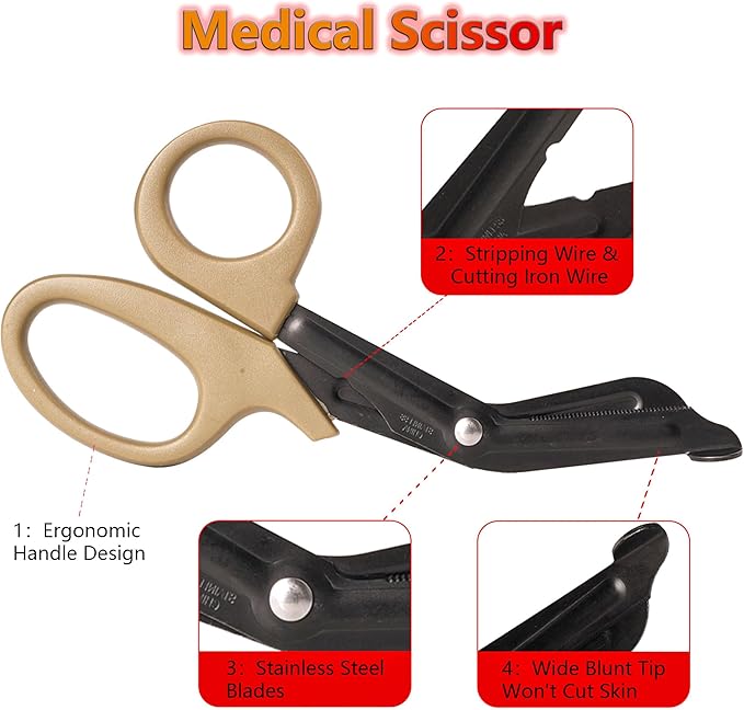 • 【Professional EMT Trauma Shear】Cut or remove clothing quickly and effectively with the EMT trauma shear. Designed for bare skin application of the tourniquette,it can easily cut through multiple layers of fabric, leather and more. The medical scissor handles are ergonomically designed for ease of use and comfort.
