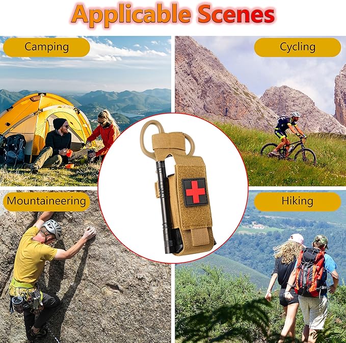• 【Universal TQ Tourniquet Pouch】Our MOLLE first aid kit is made from high quality material, reliable and wear-resistant, it can store the medical tourniquet, scissor, penlight and marking pen perfectly. The tourniquet bag's sturdy straps make it easy to carry and attach to backpacks, tactical vests, belts, or other MOLLE compatible gear, making it a great choice for your hiking adventures.