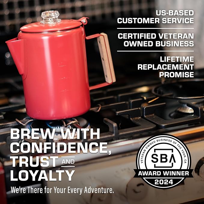 • LIFETIME REPLACEMENT GUARANTEE: Top materials & workmanship enable a superb promise. Shop with confidence. This is the last camping percolator coffee pot you will ever need. US based customer service