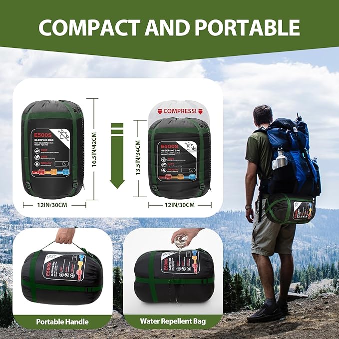 • EASY PACKING AND CLEANING - This xl sleeping bag package size is 16.5 x 12 in, weight 6 lbs. Comes with a compression sack, Machine washable, perfect for hiking, backpacking, car camping, and more