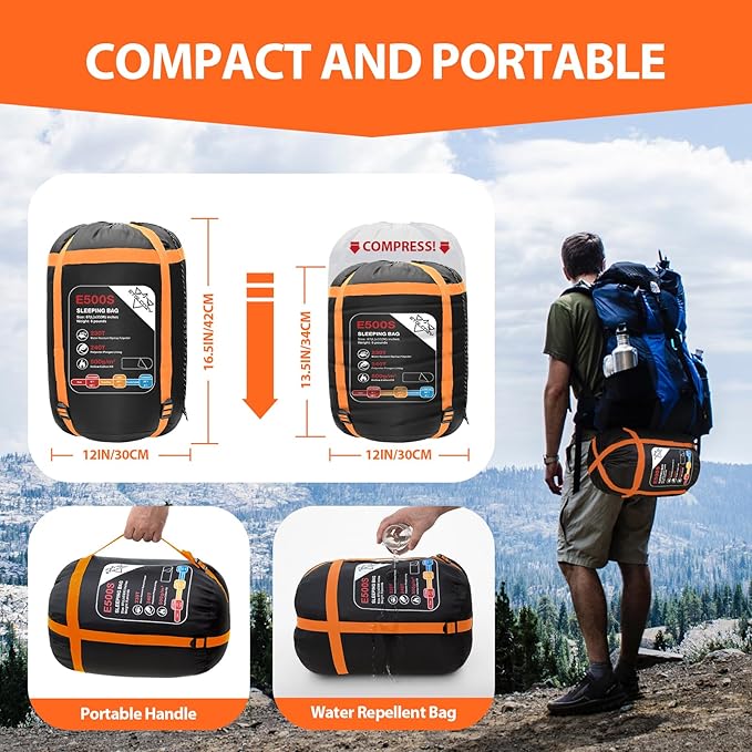 • DURABLE AND COZY - This adult sleeping bag cold weather is made of 230T rugged, water-resistant, anti-tearing polyester shell will stand up to years of rigorous adventures, With a soft lining and plenty of room to spread out