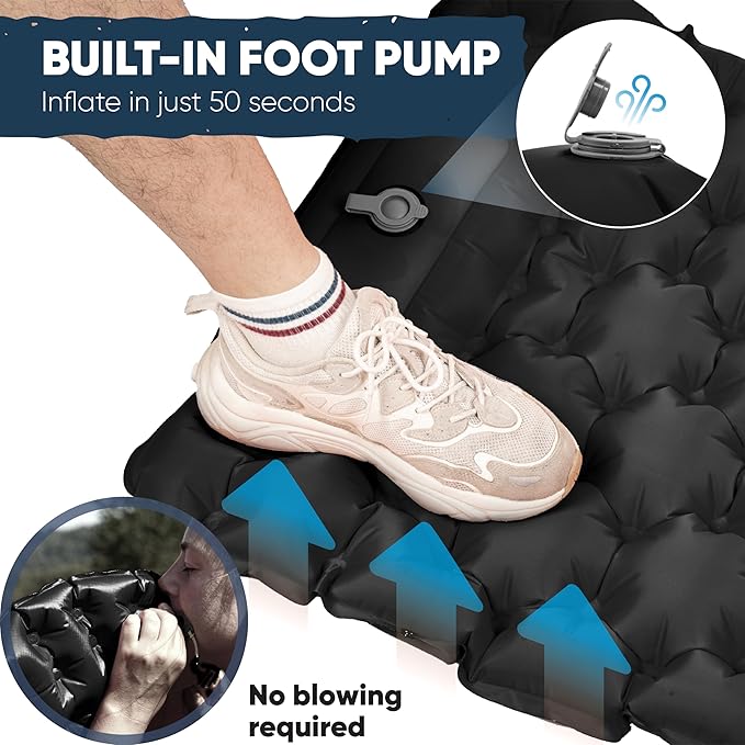 • Foot Bump to Inflating / Only 50s Stomp to Inflate & 1s Deflate: The camping sleeping pad including an innovative built-in foot pump, simple foot press around 50S to fully inflate the camping mat so you don't need to bring a pump separately. Unlike old air filling methods such as electric air pump, mouth air pump, it will be fully charged with a foot by pressing the air pump. Also It has a non-leak air valve so you shall never worry about air leaking! And it only takes 1 second to quickly deflate.