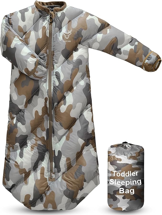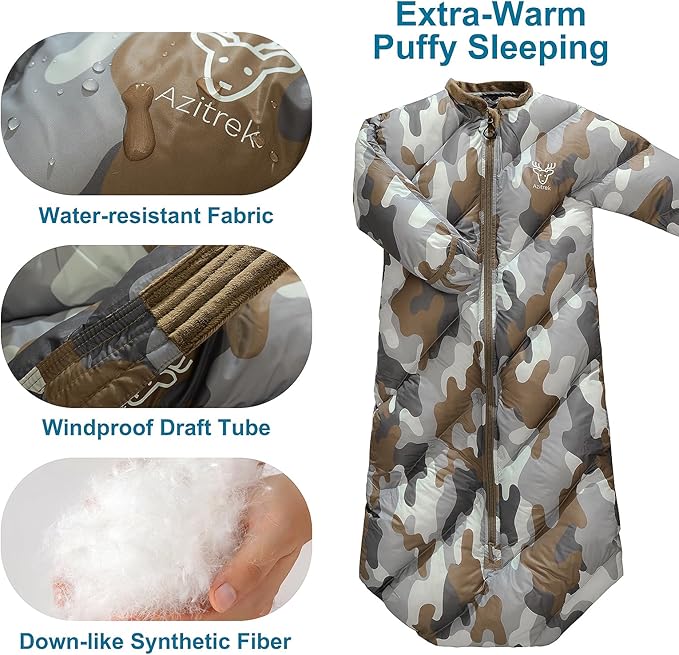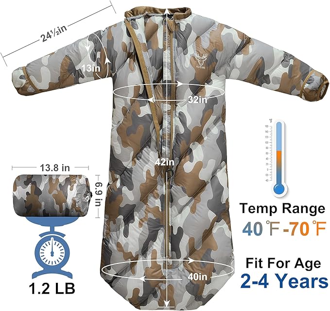 • CUSTOMIZABLE WARMTH & MOBILITY: Designed with unique sleeves featuring adjustable open & close cuffs, plus the draft tube protected 2-way zipper, this sleeping bag offers a personalized warmth experience while remaining hands free and certain mobility, making it perfect for outdoor adventures, or indoor forts and slumber parties.