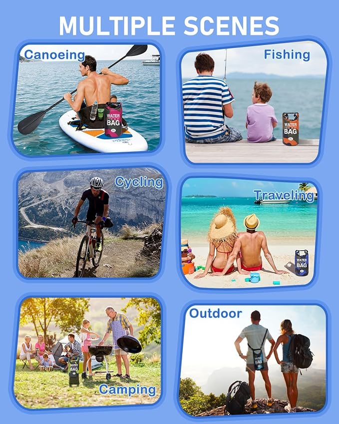• Great Matching for Versatile Use: The 2L roll top backpack sack is very useful for water activities, including swimming, kayaking, beach trips, rafting, boating, hiking, camping, and fishing. Perfect for both wet and dry storage needs.