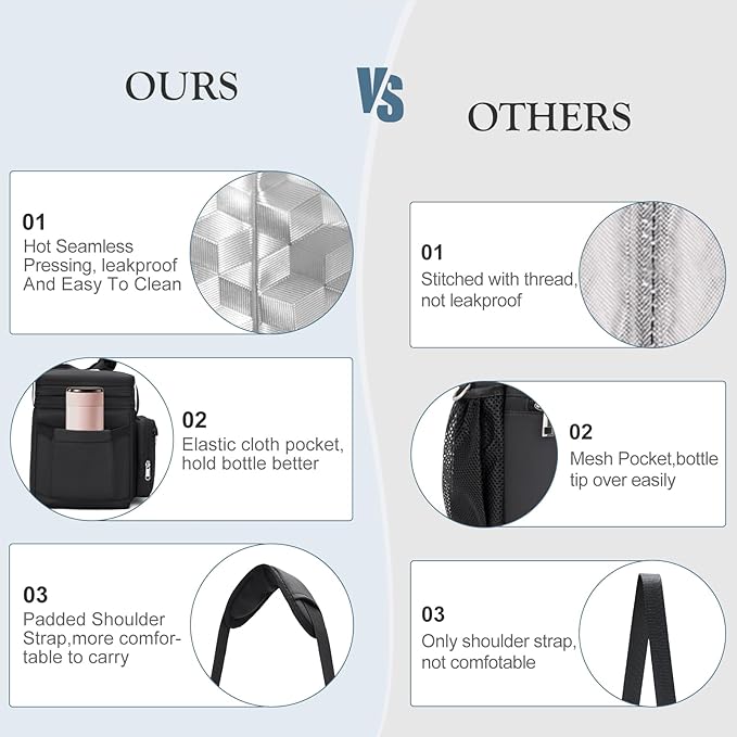 • REMOVABLE BOTTOM PANEL: The exterior of the bottom panel is wrapped with heat-insulating aluminum film, which can be placed into the bag when needed to keep the bag better stable and less likely to tip over.