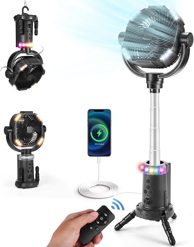 • 💡【20000mAh Battery for Extended Adventures】Power through weekend trips with a massive rechargeable battery. Doubles as a emergency phone charger - critical for wilderness safety. Charge while using (7-8hr full charge) to maintain airflow during storms or off-grid adventures.