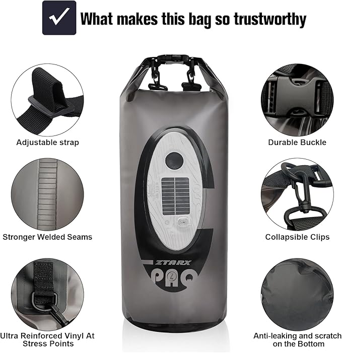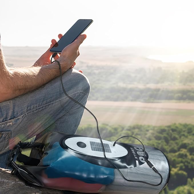 • Solar Powered and USB Powered Waterproof Bag: You could charge floating waterproof camera bag under direct sunshine through the solar board, or use the micro USB port to charge waterproof dry bag through mobile charger. (Note: Cable included, charger not included) Flexible charging method will bring you much convenience when the dry bag is used in the outdoors.