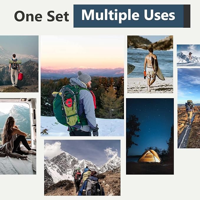 • MULTIPURPOSE: This dry bag set is ideal for a wide range of outdoor activities, including backpacking, hiking, kayaking, boating, camping, cycle touring, travel, and more.