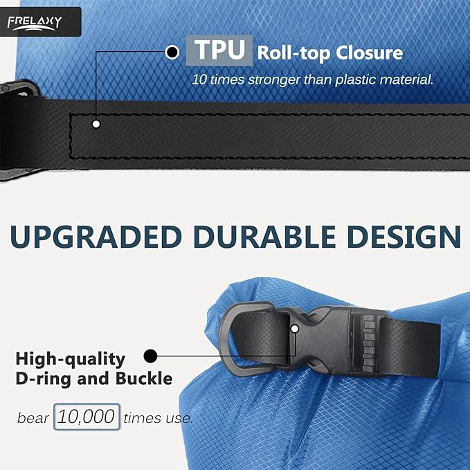 • UPGRADED DURABLE DESIGN: The dry bag is made of diamond ripstop polyester, and the roll-top closure is made of strong TPU material that is 10 times stronger than plastic. The sturdy D-ring and buckle can withstand up to 10000 uses and are easy to attach to your backpack.