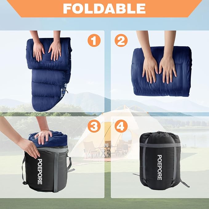 • Convenient Portability: The sleeping bag comes with a convenient storage bag, making it easy to roll up and stow away for transport and storage. These features make the POEPORE sleeping bag an ideal choice for enjoying comfort, warmth, and convenience during outdoor adventures, whether it's camping in the wilderness or relaxing indoors.