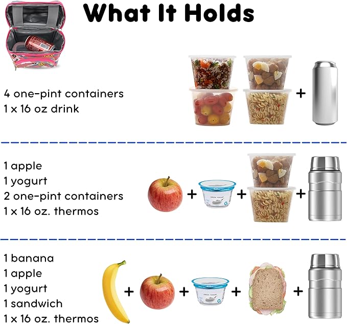 • What It Holds — Insulated lunch box holds a 12-16 oz drink, a yogurt cup, a fruit cup, a small cottage cheese container, an apple, and 2 frozen gel packs