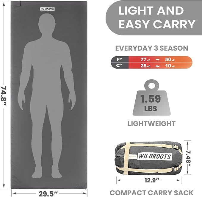 • Suitable for three seasons: Our high-quality sleeping bag is designed specifically for temperatures ranging from 50℉ to 68℉ (10℃ to 20℃). The double-layer filling technology will keep you warm and prevent moisture intrusion, allowing you to enjoy a comfortable sleep during hiking, outdoor camping, traveling, or any other outdoor activities